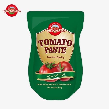 The 210g stand-up pouch of tomato paste presents unmatched convenience and functionality as a packaging option. Designed to stand upright on shelves or in storage, it ensures easy organization and accessibility. With its generous 210-gram capacity, this pouch offers versatility for a variety of recipes, including pasta sauces, stews, soups, and marinades. Crafted from durable materials, the packaging effectively preserves the freshness and flavor of the tomato paste. It is particularly favored by individuals who prefer smaller quantities or wish to explore different brands without committing to larger cans or jars.